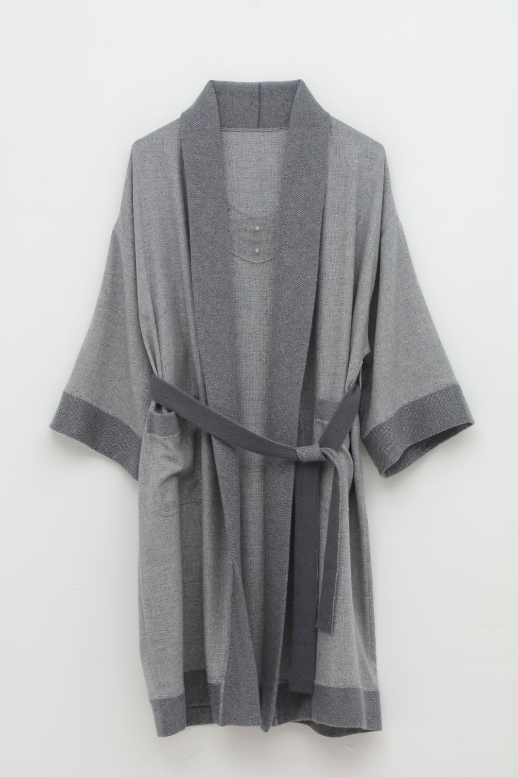 Indulge in ultimate comfort with our exquisite cashmere and yak wool blend robe, adorned with...
