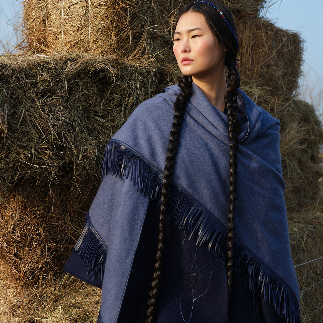 Pure cashmere shawl with nappa leather fringe, made by 100% baby cashmere sourced from family-owned...