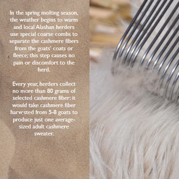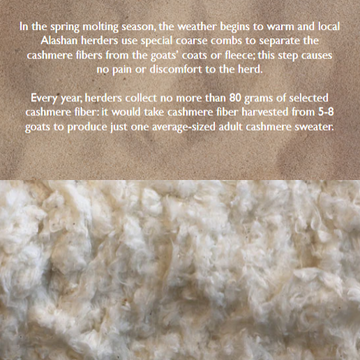 The soft downy undercoat of cashmere goats has evolved to survive the area’s long and harsh winters. These undercoats consist of the highest quality lightweight fibers able to retain eight times more warmth than wool.