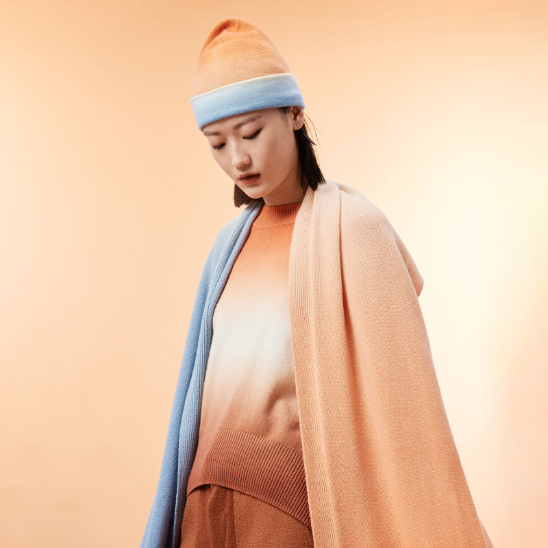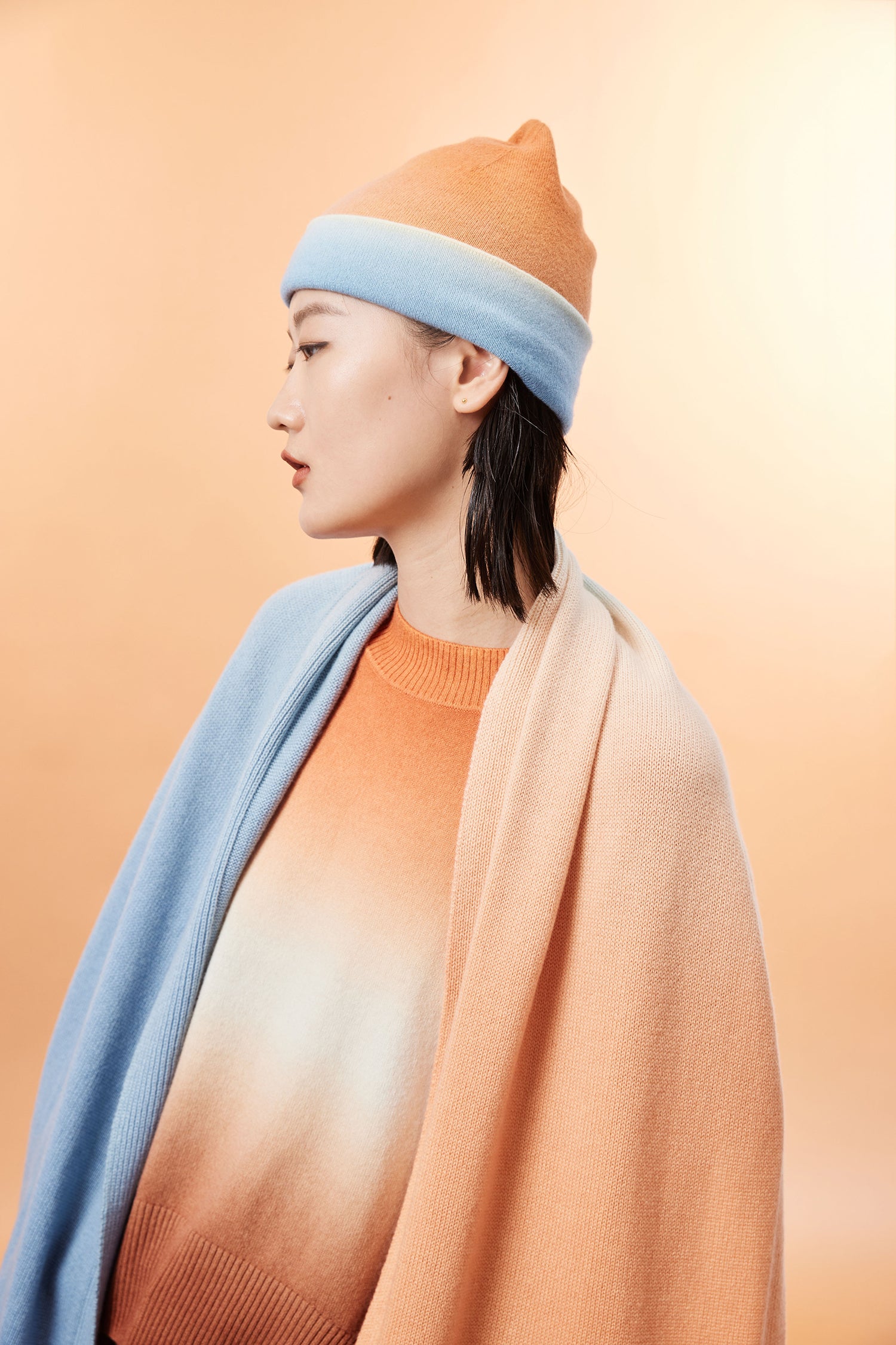 Gradient knitted cashmere scarf, fine-ribbed hem, handmade dip-dyed.