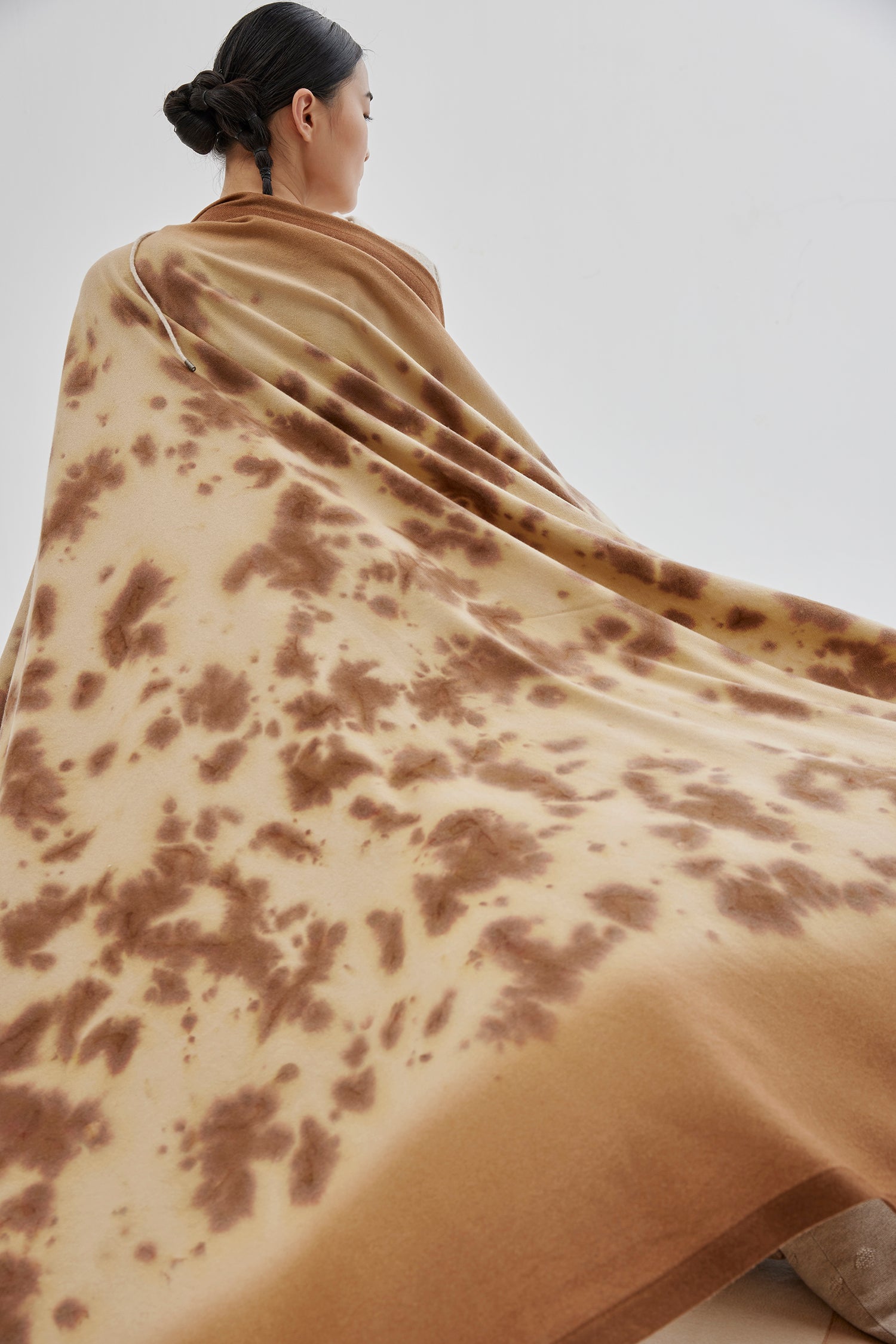 Pure cashmere tie-dyed blanket, the handmade dyeing process gives the fabric unique pattern, featuring jersey border. Relatively light weight, natural and warm color, a perfect fit for domestic life and travel.