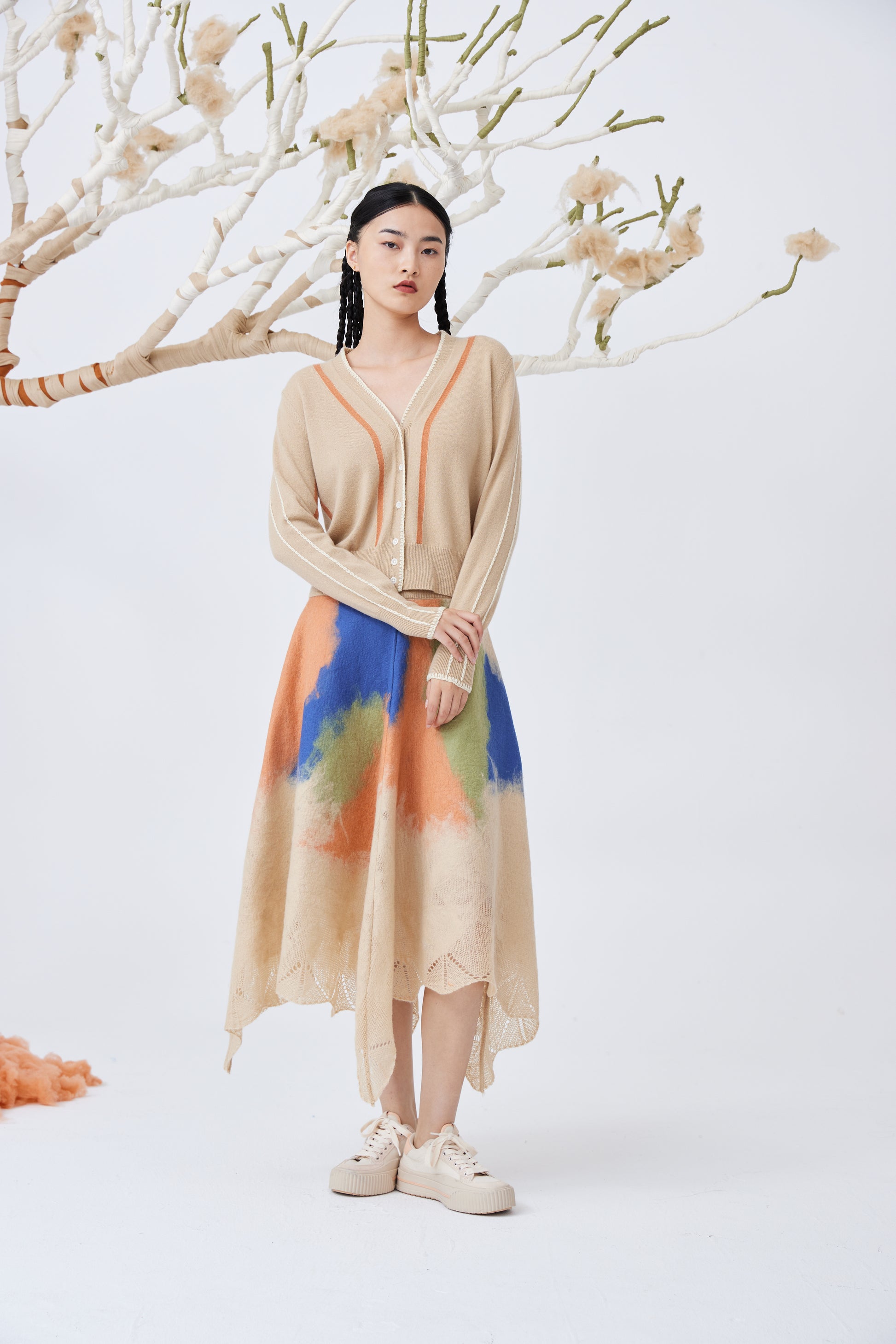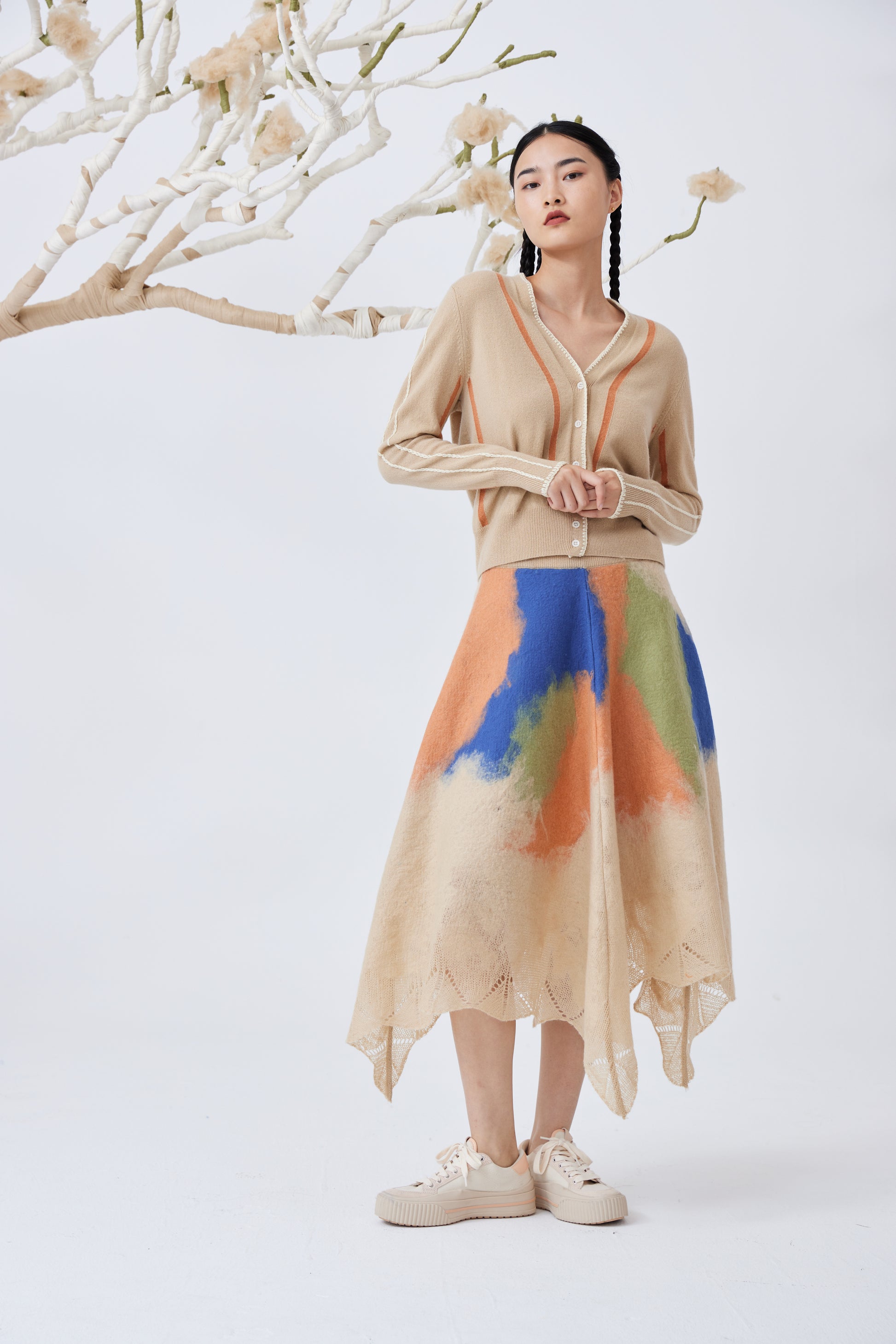 Unique traditional Mongolian handcrafted cashmere felting skirt on top of knitted cashmere fabric. Handmade tassels with a flared at the hem. Multi-colored pattern on the top and pointelle-detailed pattern at the bottom. An artistic handcraft with the idea of sustainable fashion.