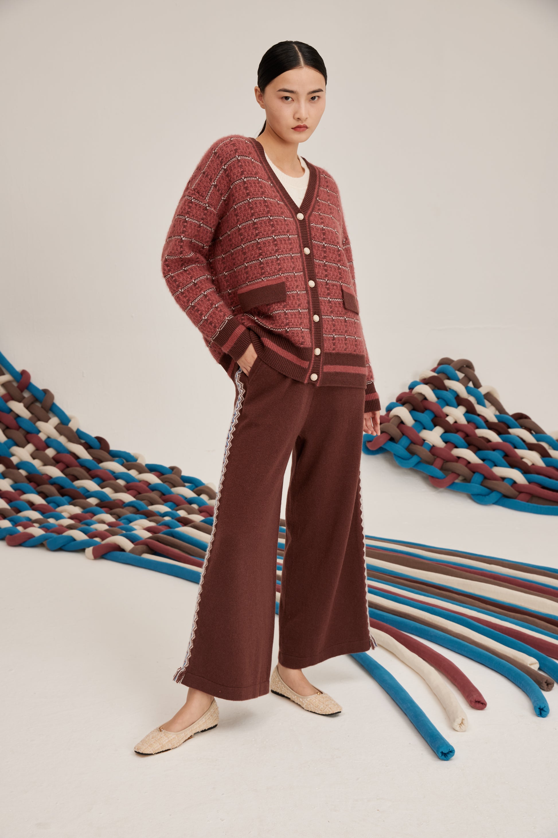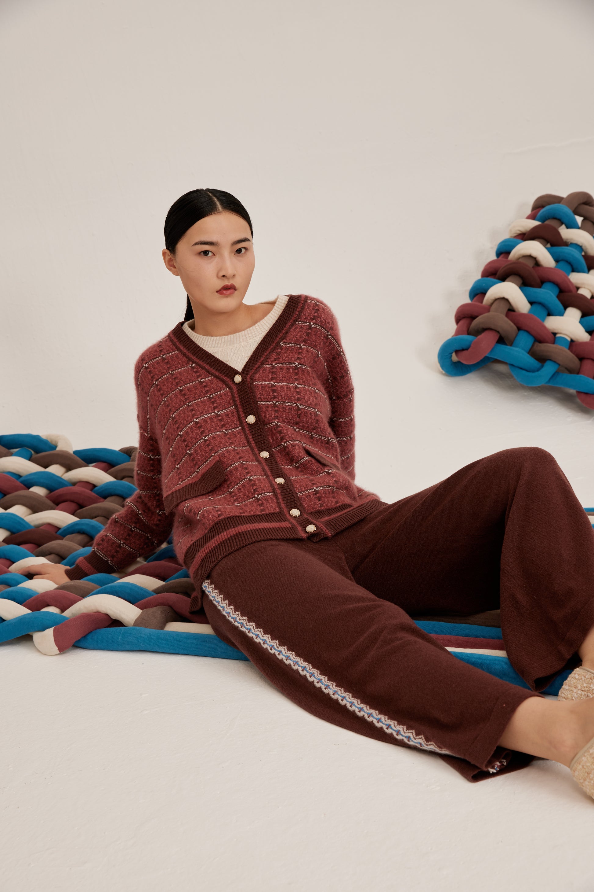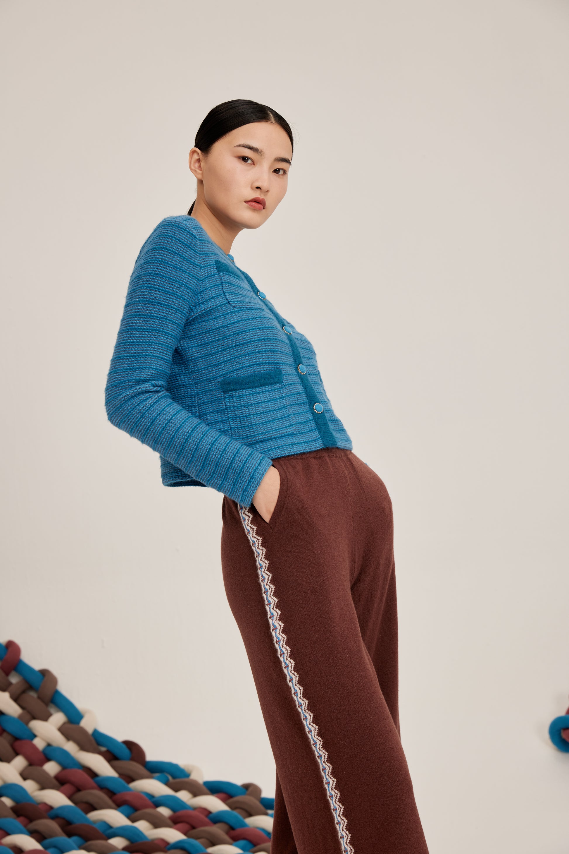 100% cashmere ribbed-knit trousers with elastic waist and colored side strips.