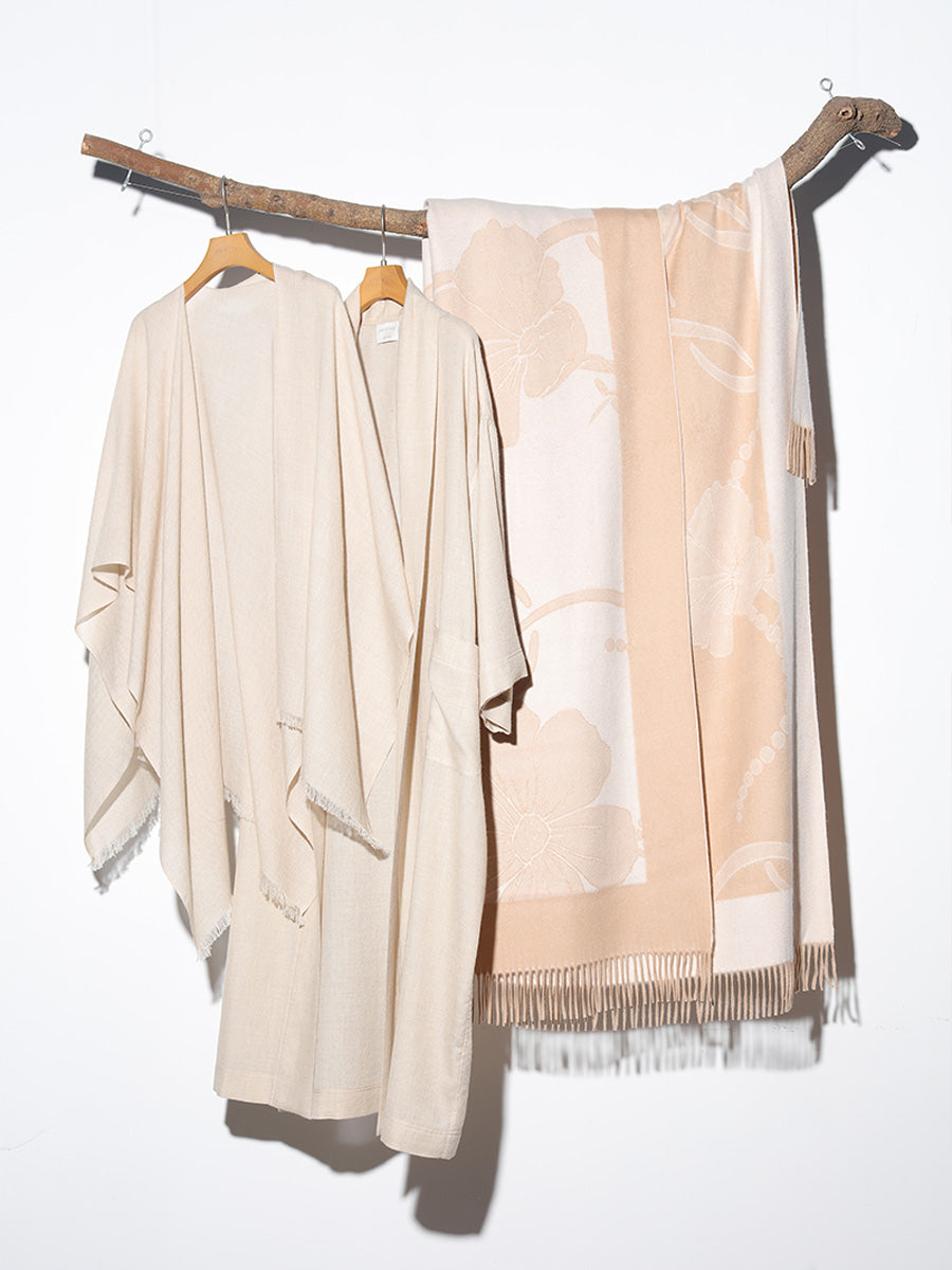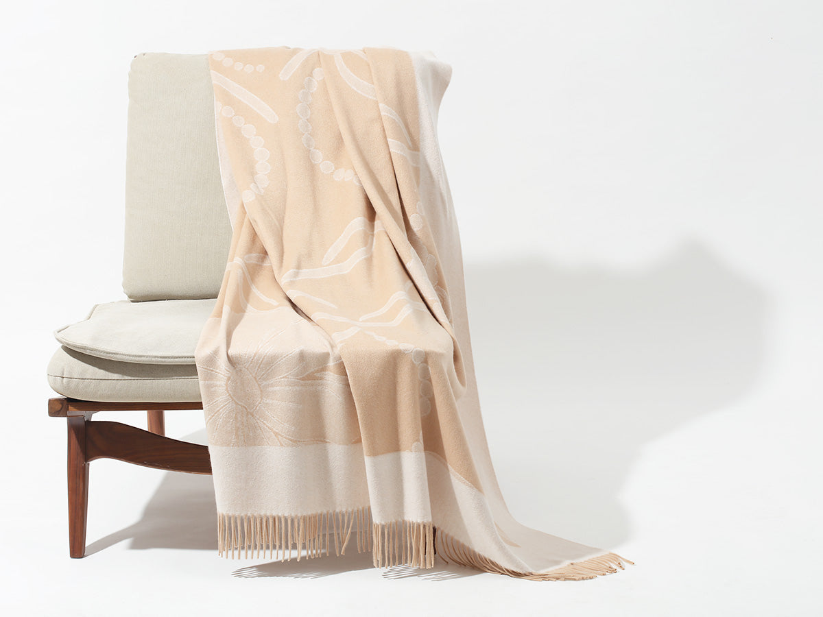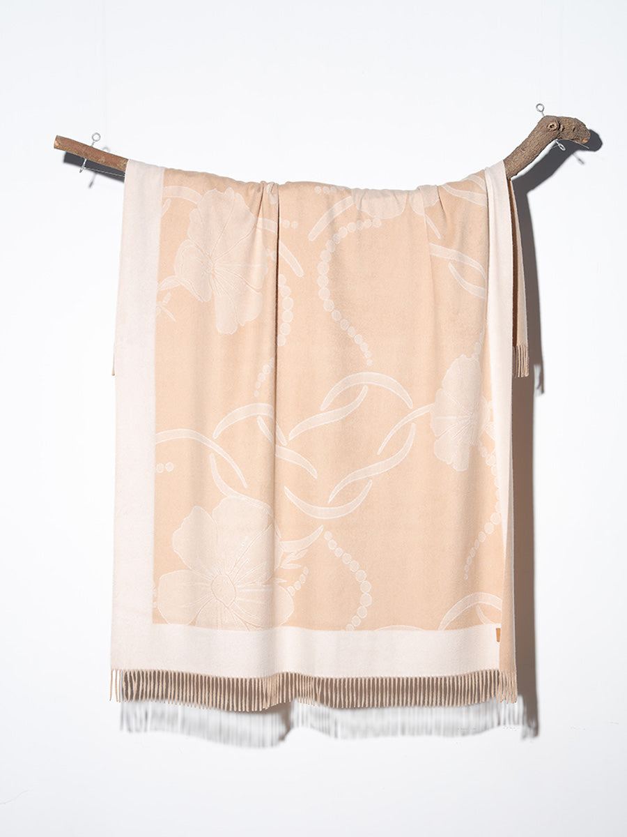 Inspired by Tibetan culture, this cashmere throw showcases a beautifully detailed jacquard-woven floral pattern.