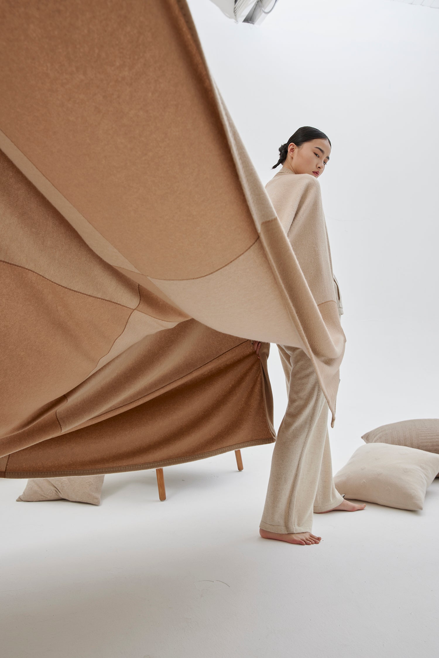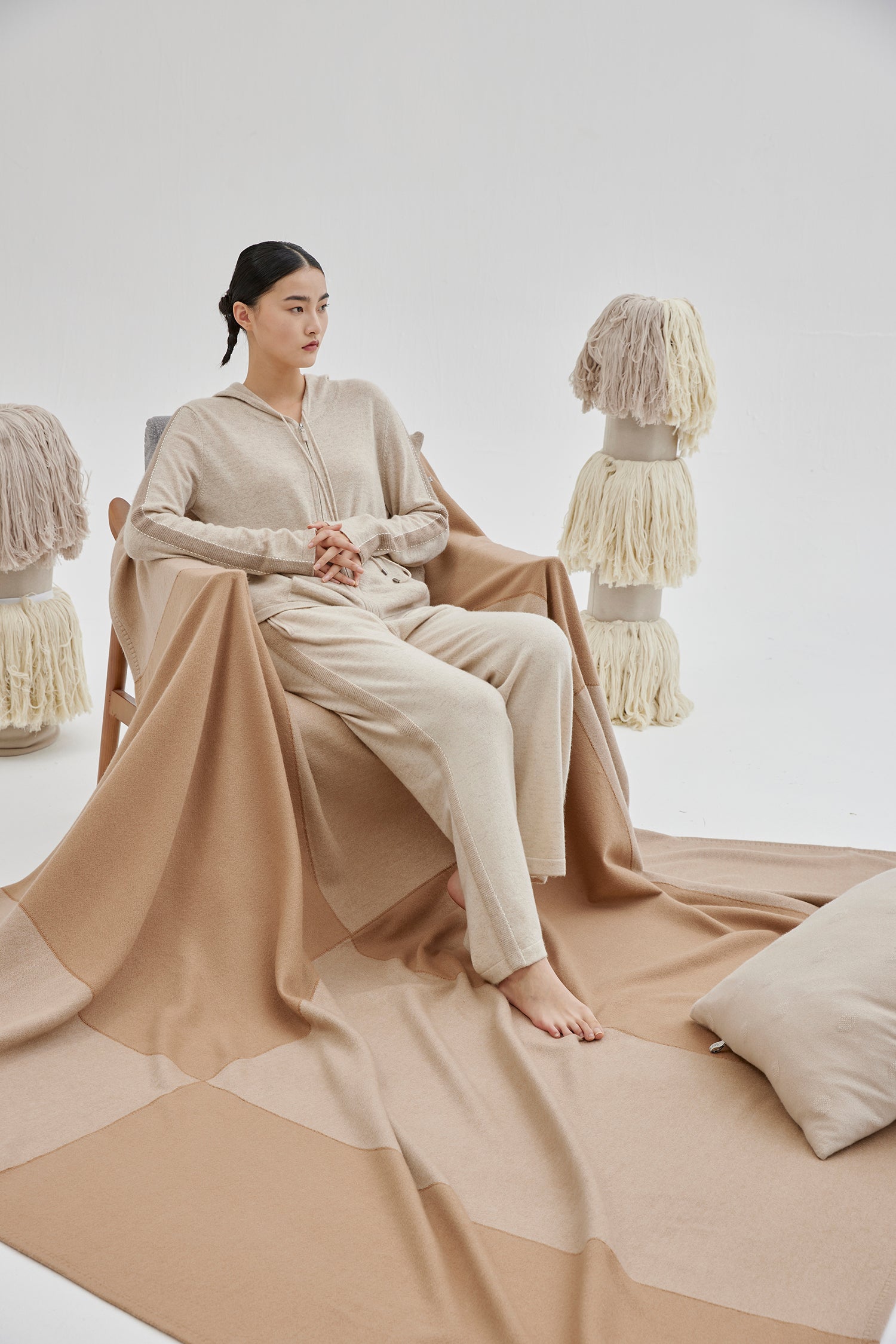 Pure cashmere blanket with two-tone color joint together. Serging techniques makes the seams tighter and last longer. Adhere to using natural, environmentally friendly cashmere that is free of additives. This ensures that the cashmere fibers retain their original color and glow.