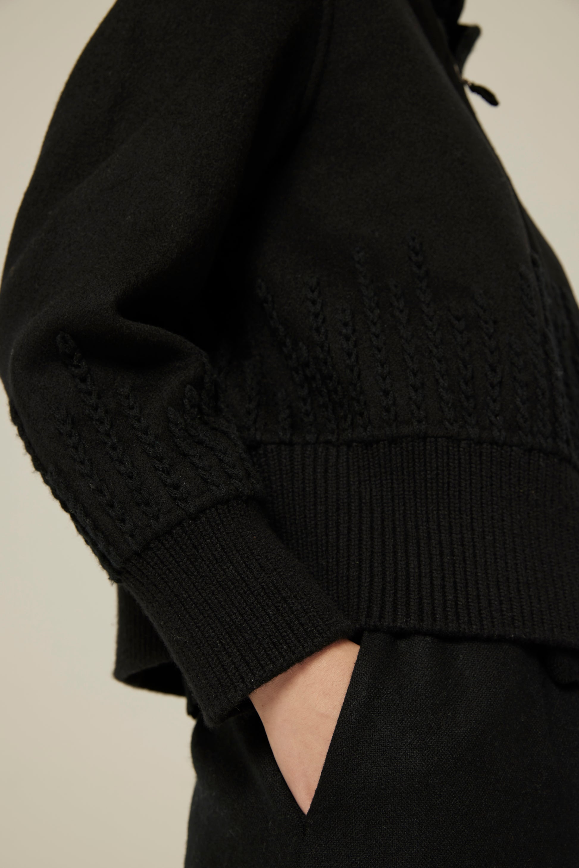 100% cashmere jacket joint with knitting and woven fabrics, featuring hand embroidered patterns on the bottom.