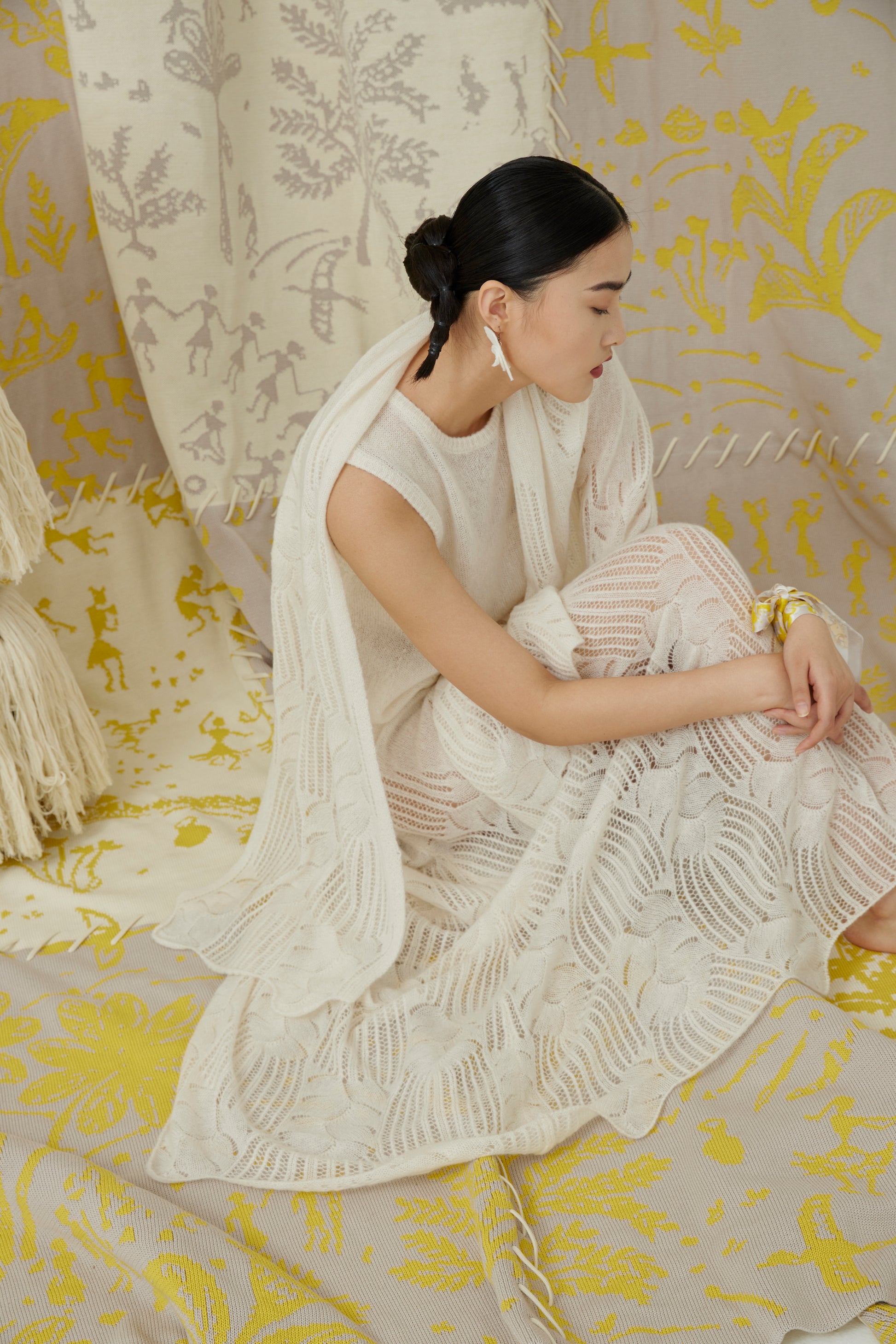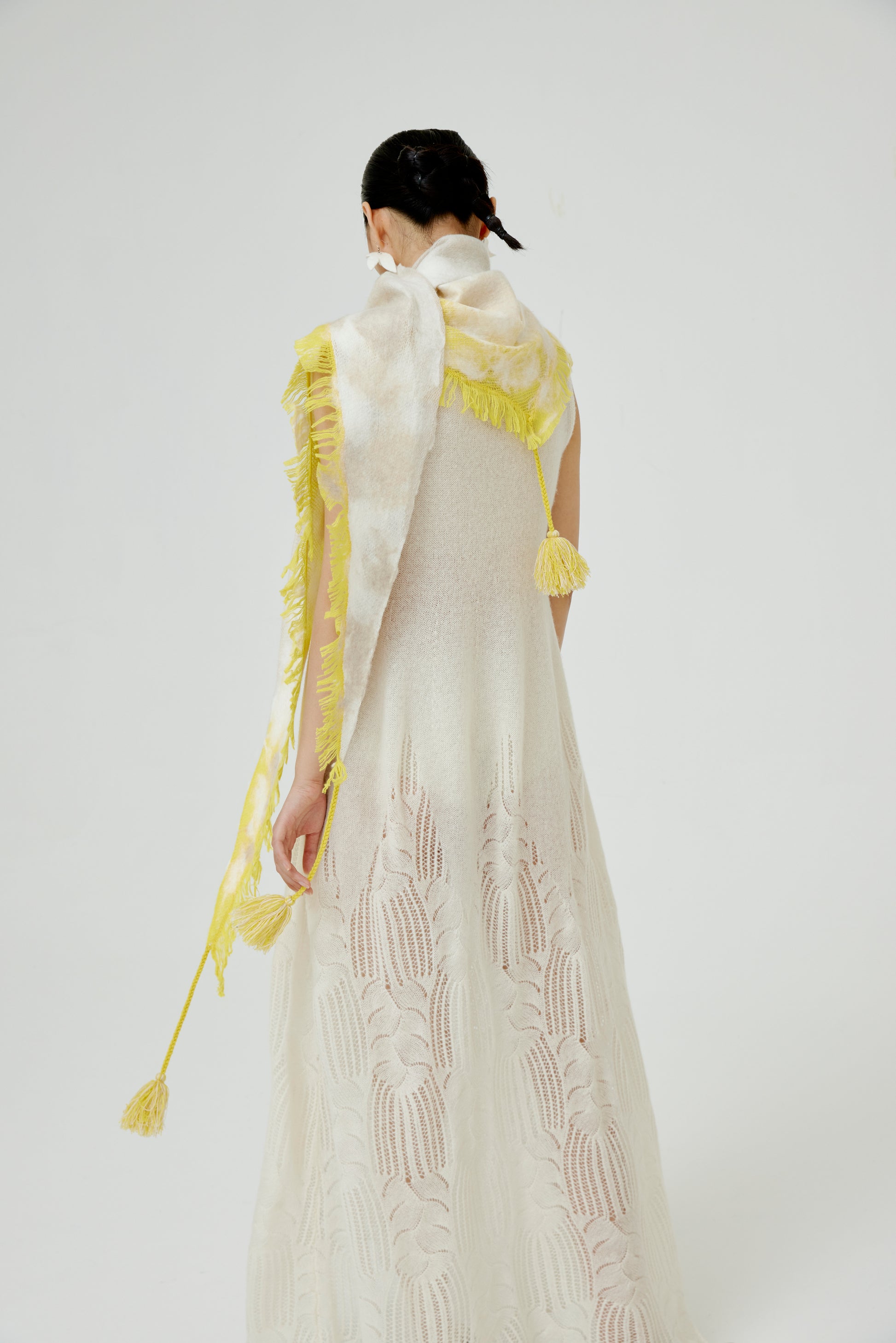 100% cashmere sleeveless crew neck loose fit maxi dress with delicate pattern formed from open-knit.