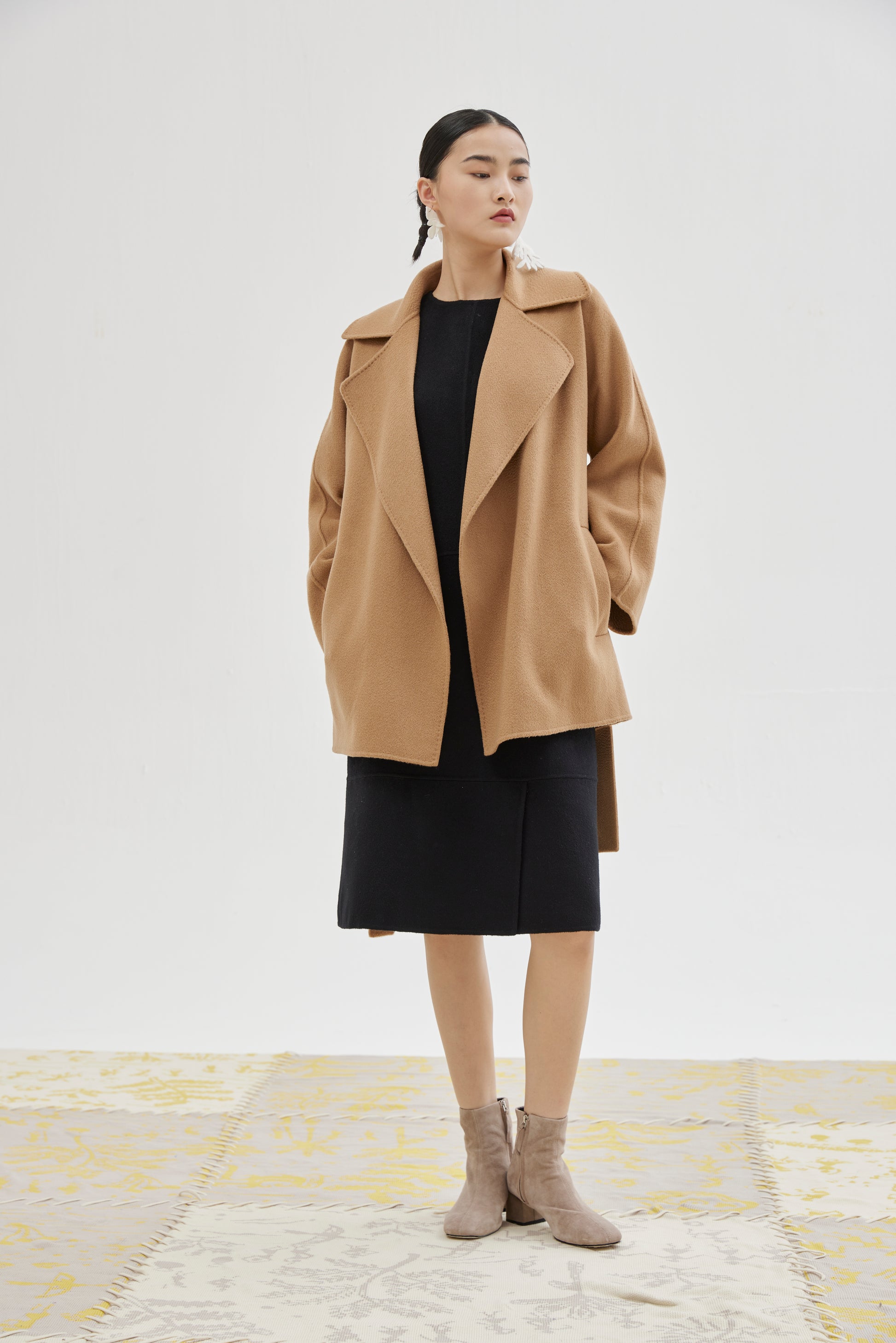 Double-faced sable cashmere, hand-sewn short cut featuring a lapel collar, welt pockets. Matching belt fastening.