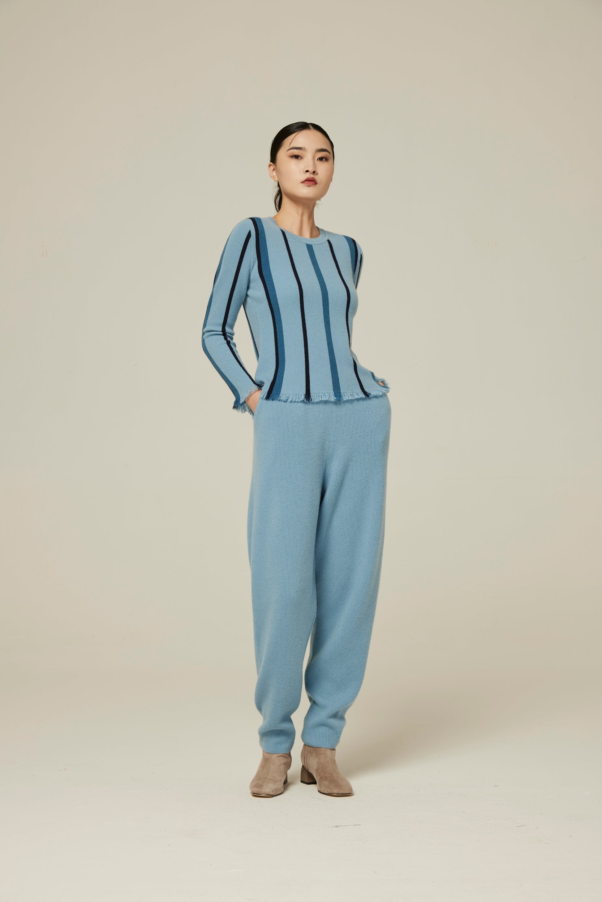 100% cashmere ribbed-knit tapered trousers with elastic waist and slant pockets.