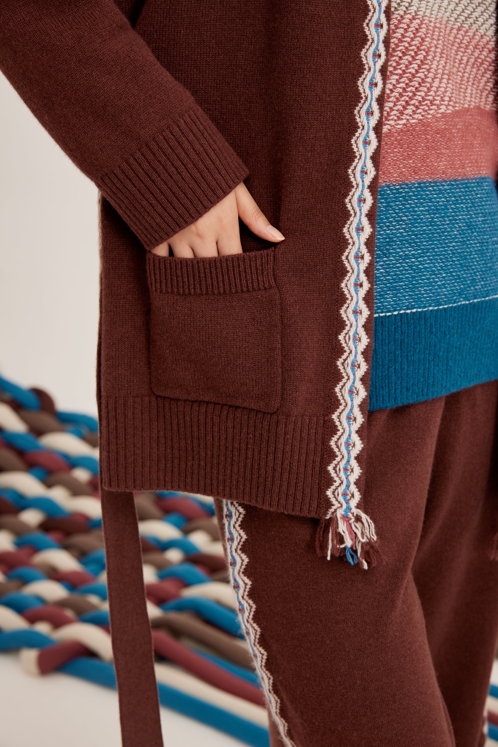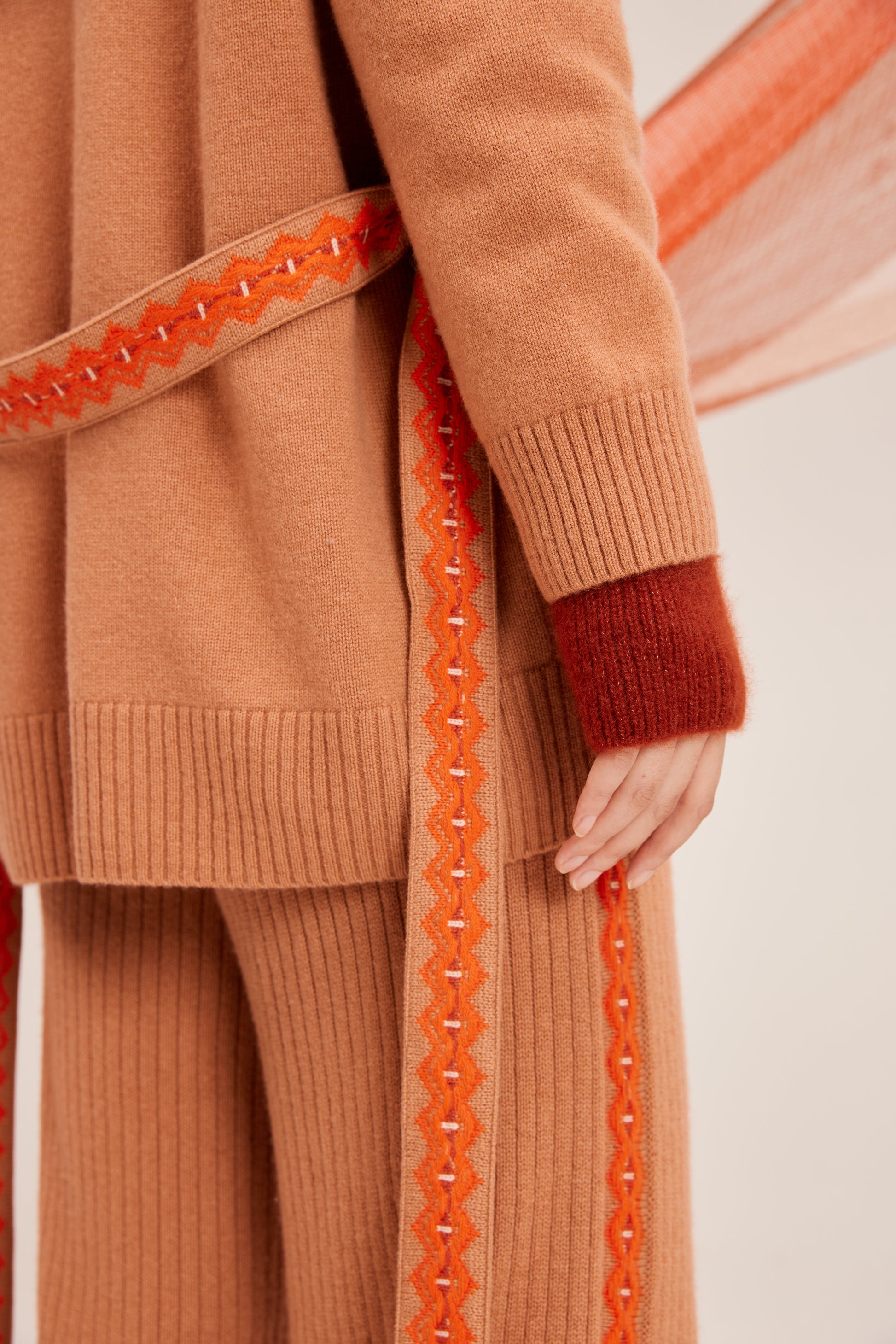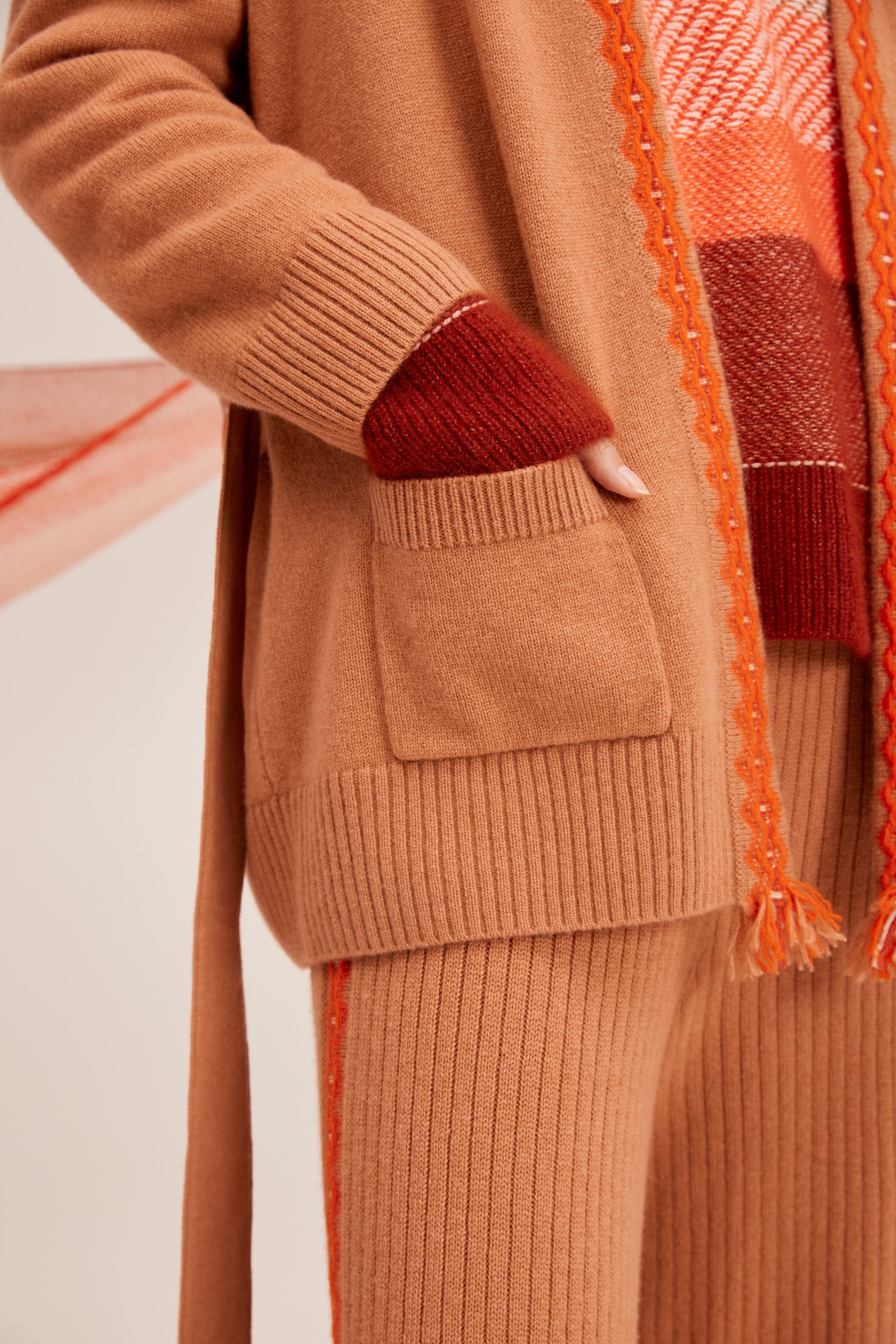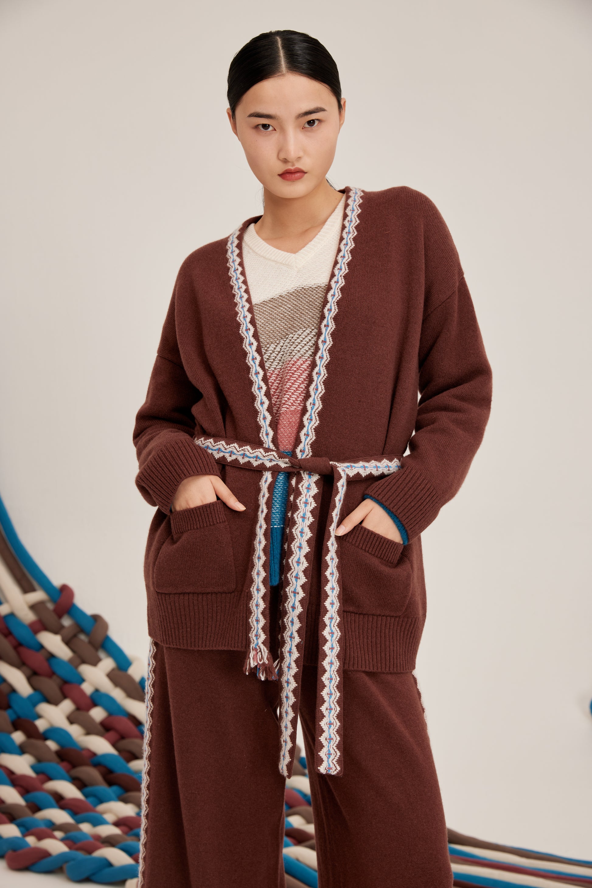 100% cashmere cardigan featuring colored strip and matching belt fastening