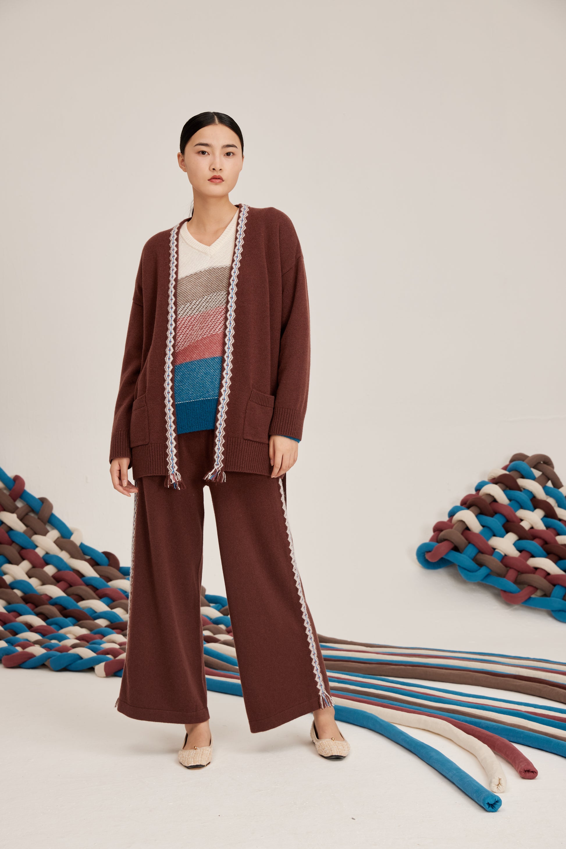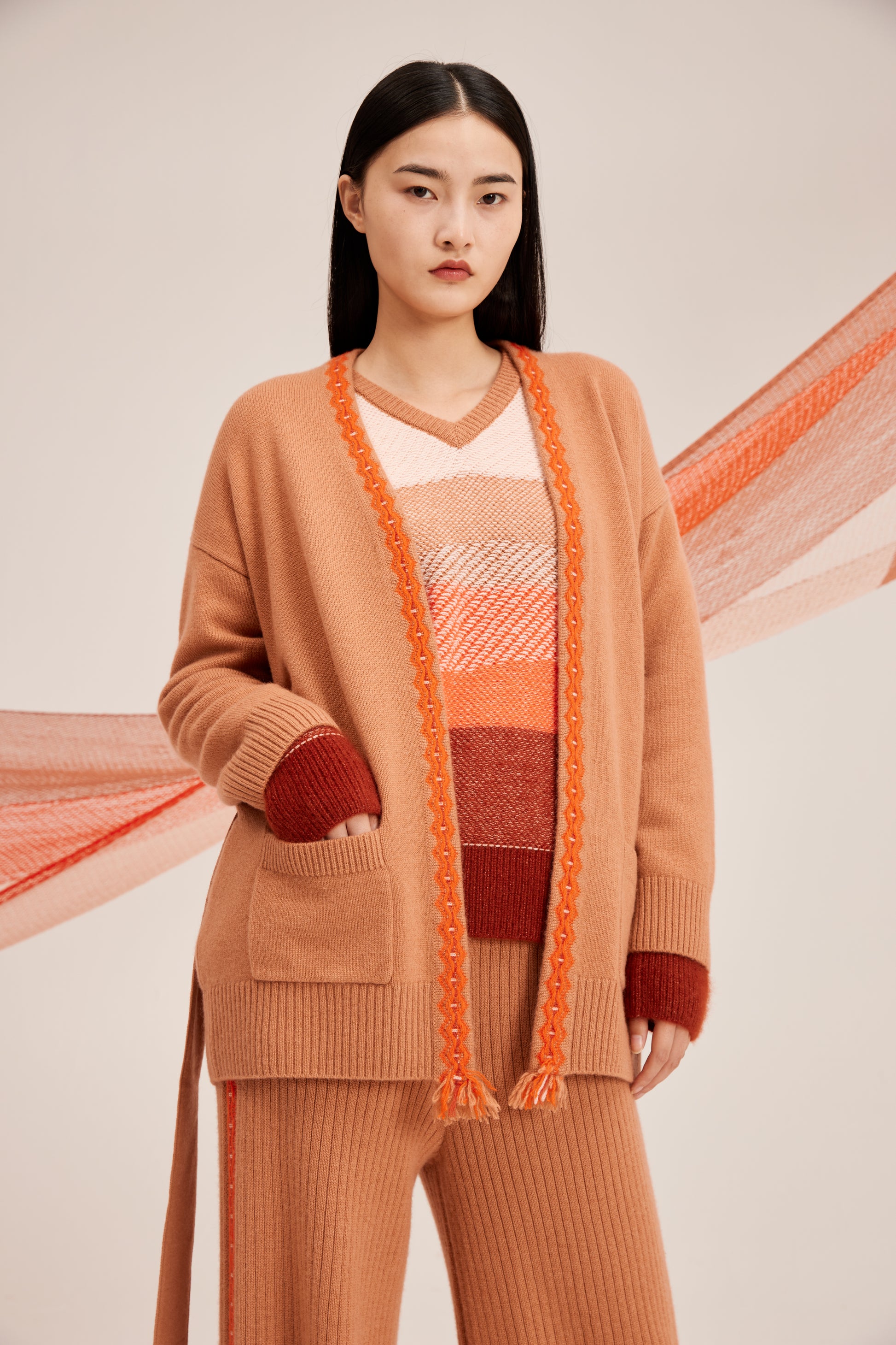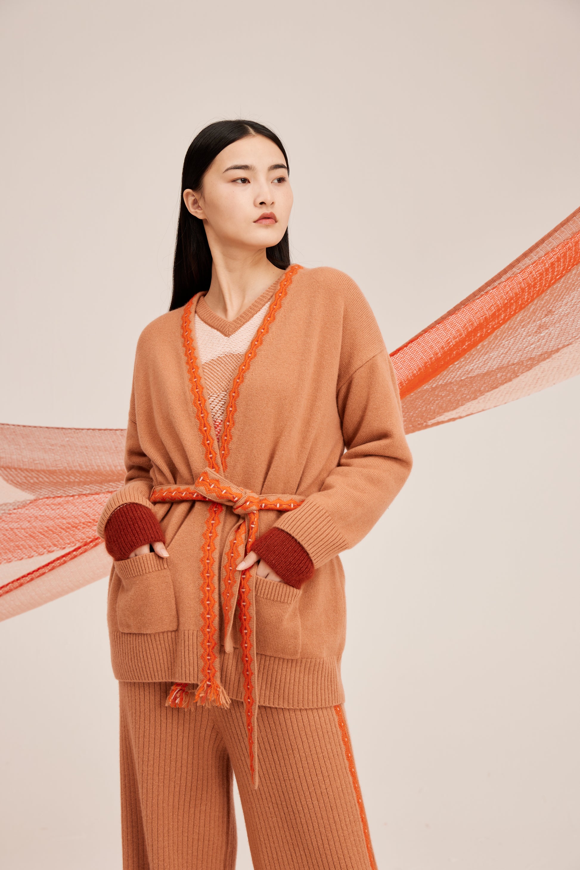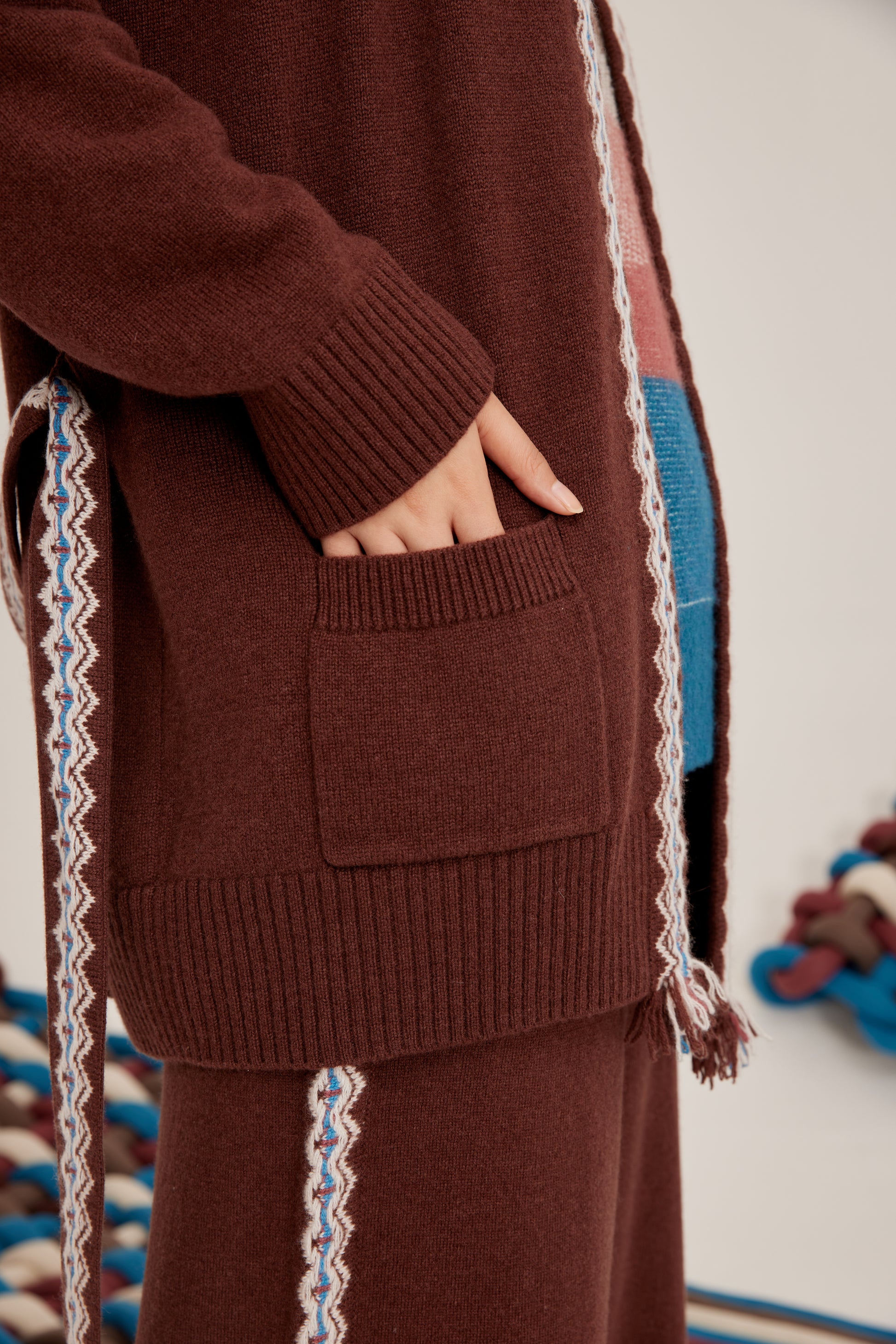 100% cashmere cardigan featuring colored strip and matching belt fastening