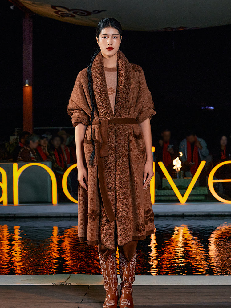 Selected cashmere knitted fabric, with a terry exposed jacquard technique featuring a Gesang flower pattern, presenting a three-dimensional texture with distinct raised petal patterns, and the underlying terry is faintly visible. The placket is designed with thick terry, which is thick and full