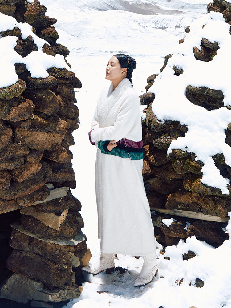 Artfully crafted with a contrast-color jacquard panel at the waist, this piece combines intricate embroidery with a deceptively simple yet meticulously crafted design. A subtle jacquard texture emerges throughout the main fabric, while the placket and cuffs feature raised towel embroidery—rich, three-dimensional, and a testament to exquisite Tibetan artistry. Fully hand-linked for a seamless, flat finish, it delivers refined warmth and exceptional detail.